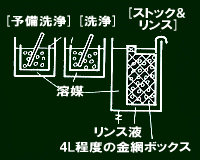 分離したメジアはバッチごとに、完全洗浄すると効率が劣るため、予備洗浄→洗浄を行なった後、ストック&リンスボックスに貯めておき、集中処理を行なう。 |